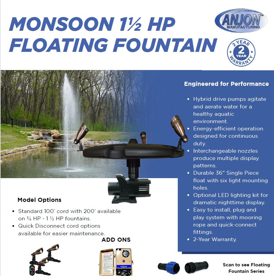 Anjon 1.5 HP Monsoon 15,000 Floating Fountains beautify and aerate ponds and lakes. These stunning and energy efficient decorative fountains include thirteen interchangeable nozzles to produce thirteen unique display patterns. Anjon floating fountains agitate and aerate the water, promoting a healthy aquatic environment for fish and plants.