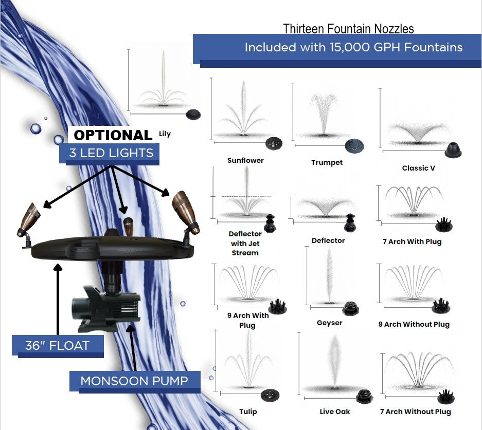 Anjon Manufacturing 1.5 HP Monsoon 15,000 Floating Fountains with 13 Interchangeable Nozzles!
